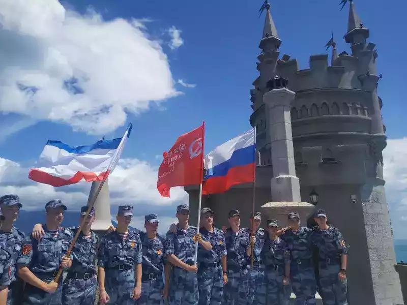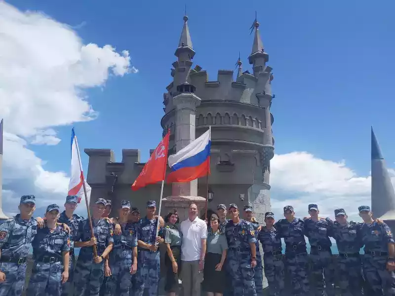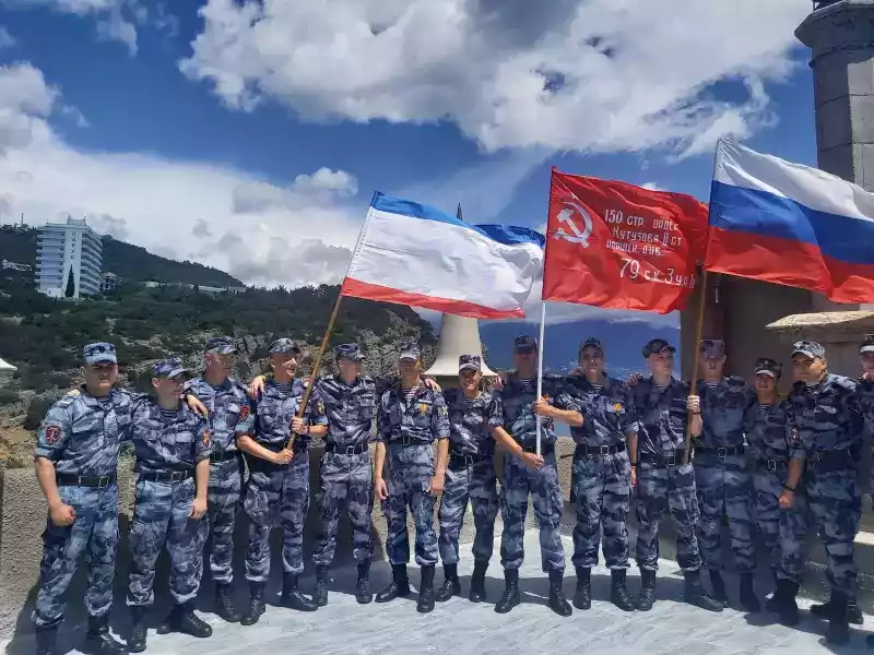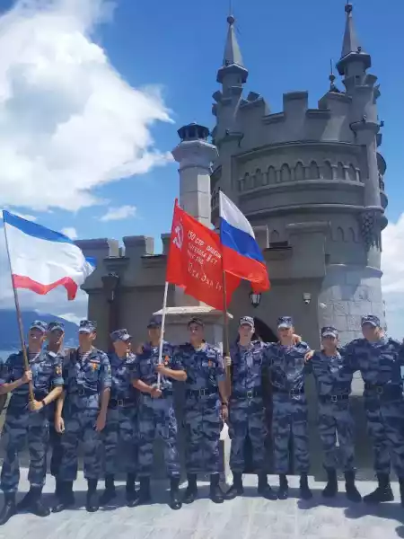 Военнослужащие, проходящие военную службу по призыву, охраняя общественный порядок в то время, как военнослужащие, проходящие военную службу по контракту, офицеры, генералы Росгвардии с честью и достоинством выполняют свой воинский долг во время выполнения боевых задач в зоне проведения Специальной Военной операции по защите Донбасса. Солдаты и сержанты – Росгвардейцы служившие в г. Ялта, пгт Гаспра, войсковой части 6919 Федеральной службы войск национальной гвардии России выполнили свой служебный и воинский долг по охране общественного порядка на Южном берегу Крыма и на всю жизнь оставили для себя память, сфотографировавшись на Ласточкином гнезде с флагами Крыма, России и знаменем Великой Победы.