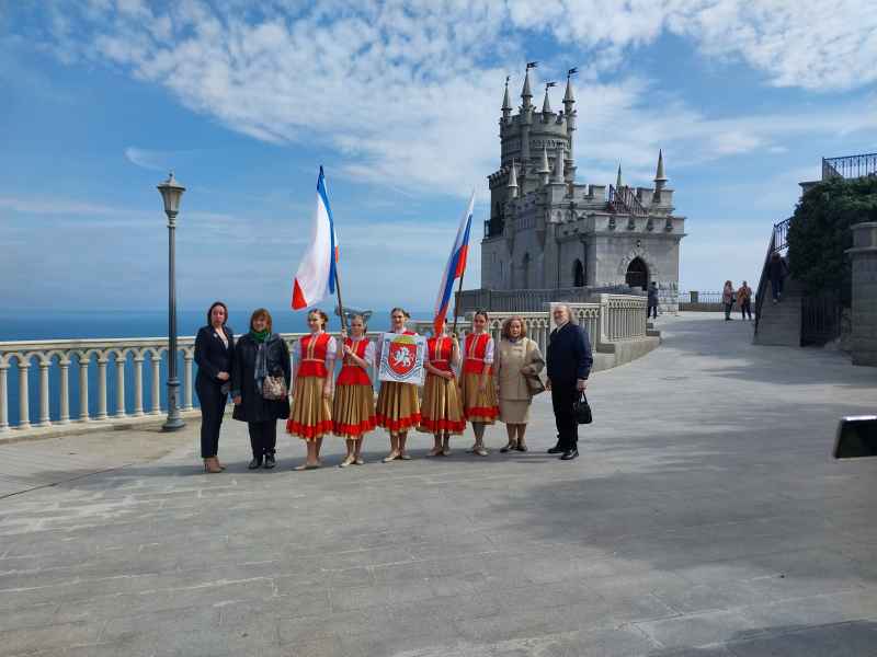 В финале мероприятия заслуженные художники Крыма и юные крымские танцовщицы традиционно сфотографировались с Флагом России, Крыма и гербом Республики Крым на фоне архитектурного шедевра Крыма и России «Дворца-замка «Ласточкино гнездо».