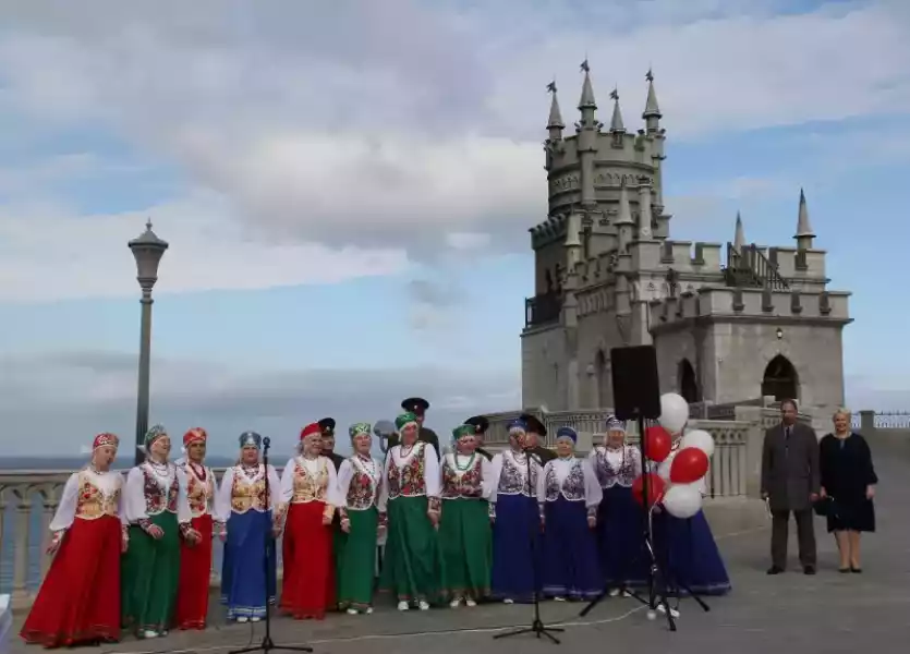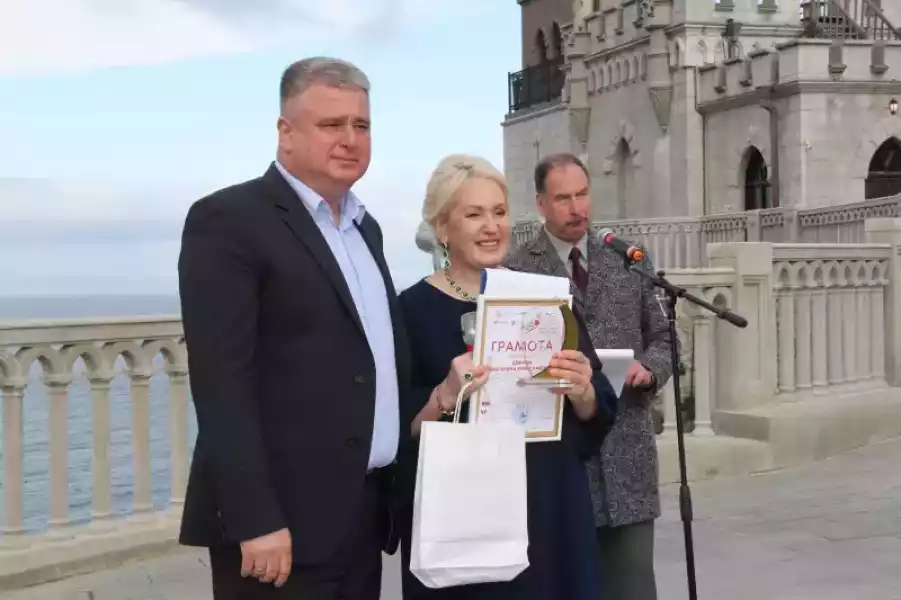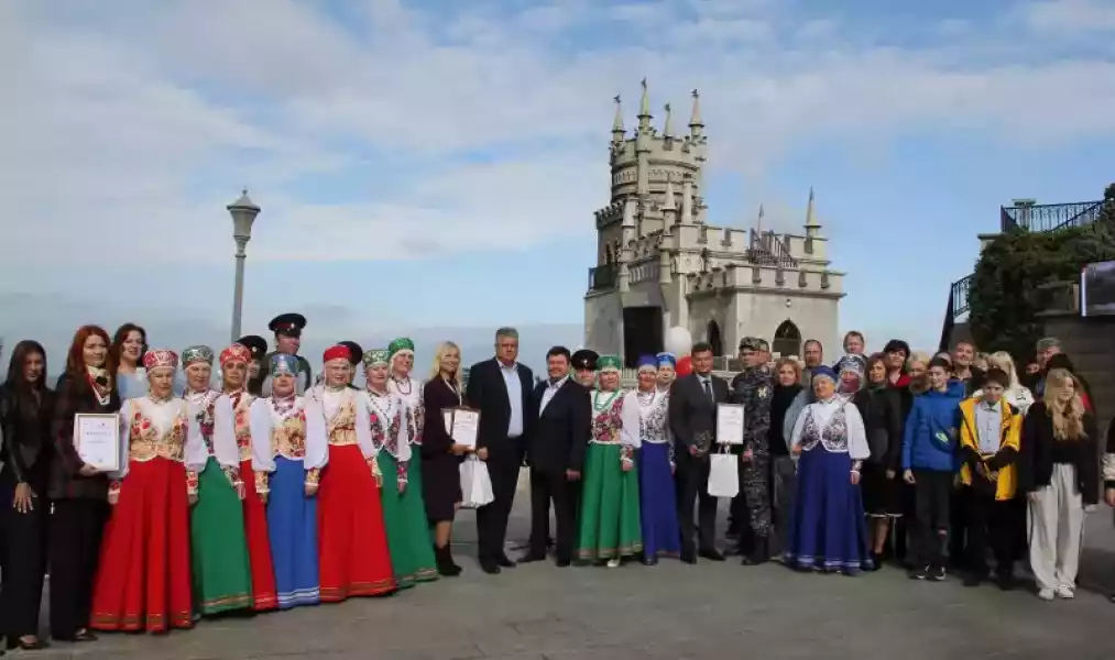 В завершении церемонии награждения Всероссийской акции Культурный код Донора участники мероприятия сфотографировались на фоне уникального объекта культурного наследия Федерального значения, известного во всем мире – «Дворца-замка «Ласточкино гнездо».