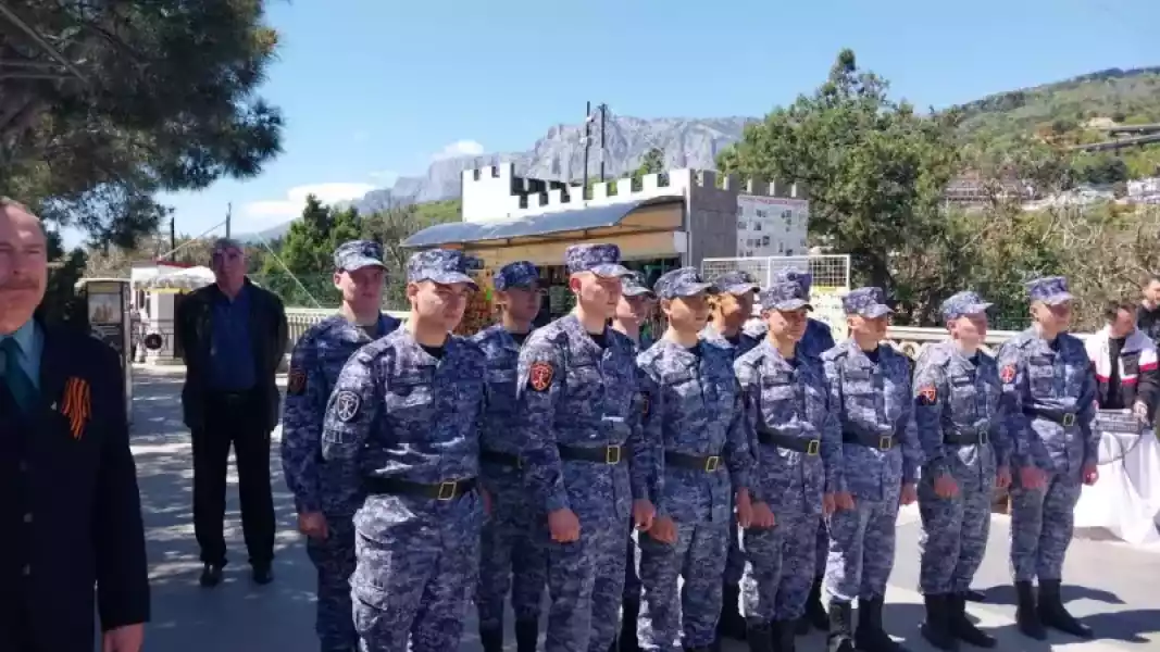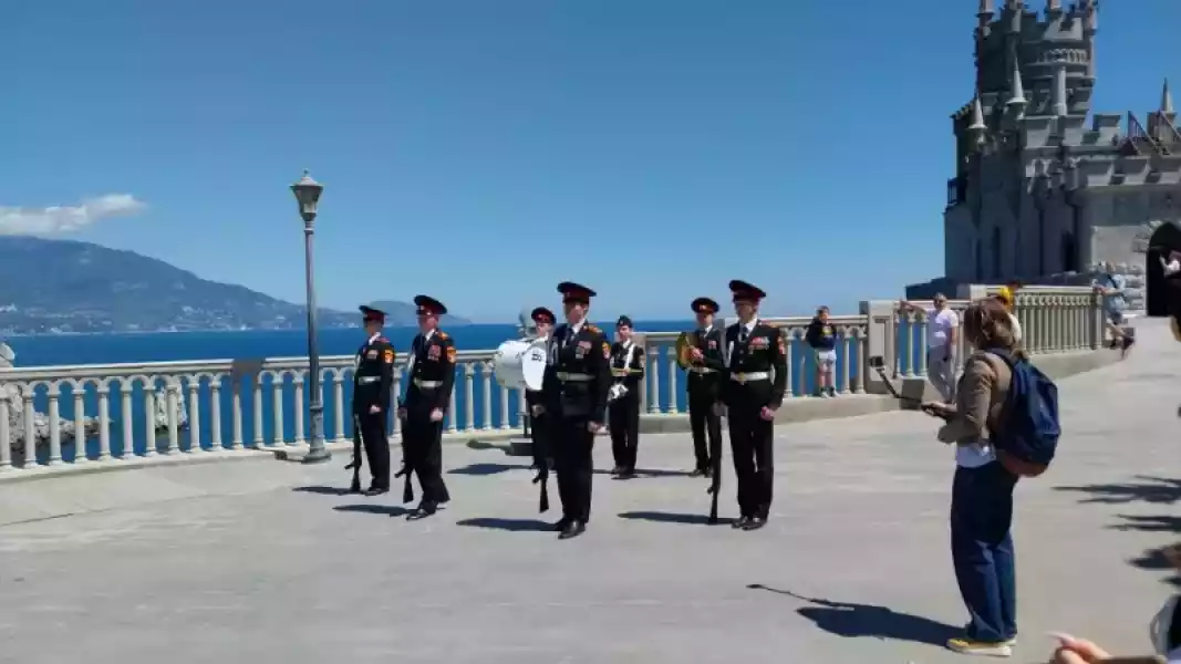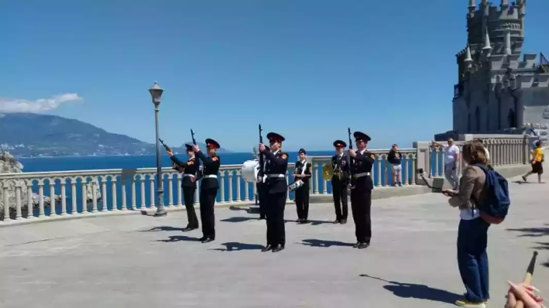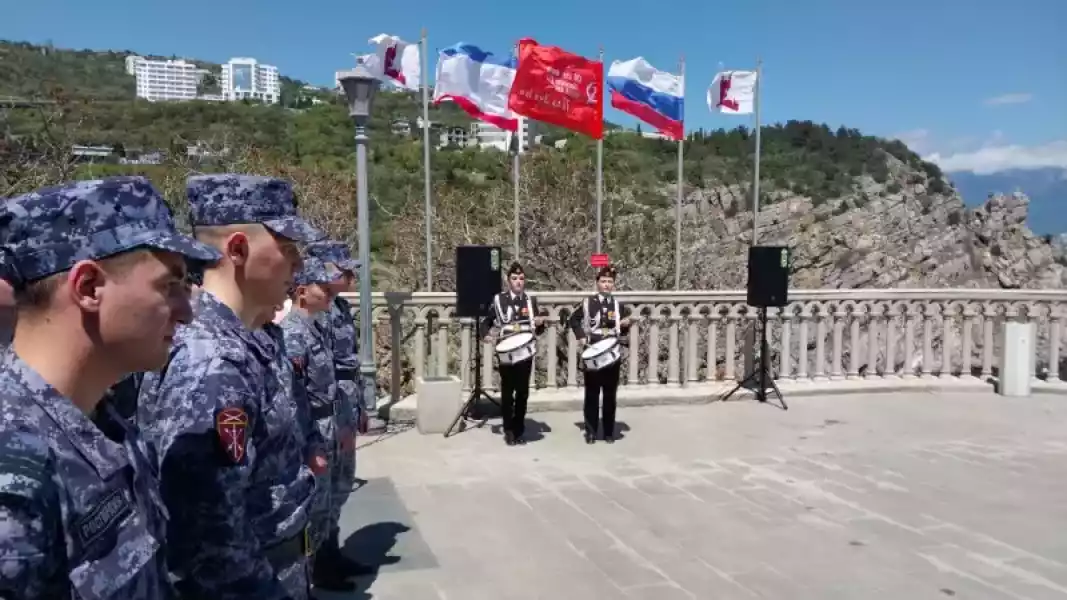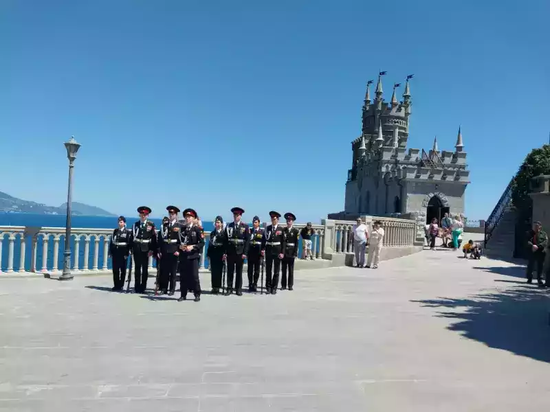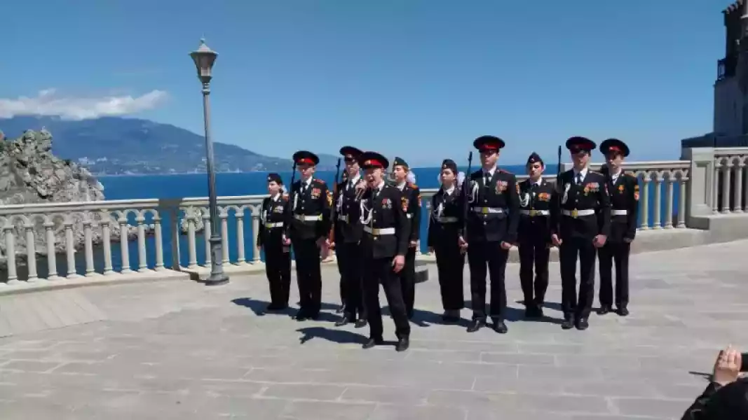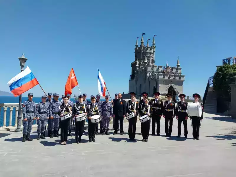 В финале военно-патриотического мероприятия кадеты и военнослужащие Россгвардейцы сфотографировались на память на фоне объекта культурного наследия Федерального значения «Дворца-замка «Ласточкино гнездо» с флагами Победы, Российской Федерации, Республики Крым.