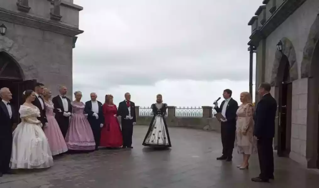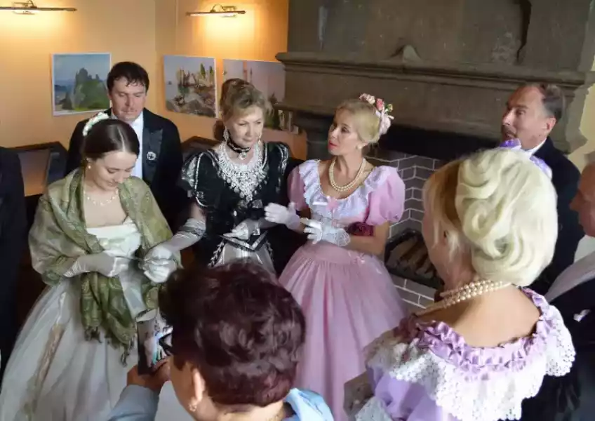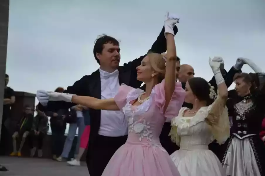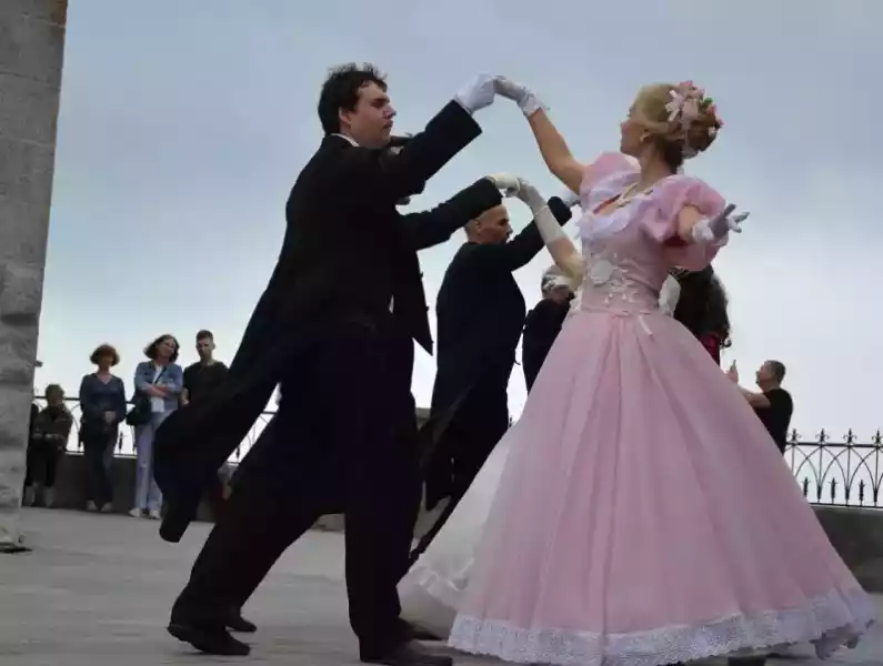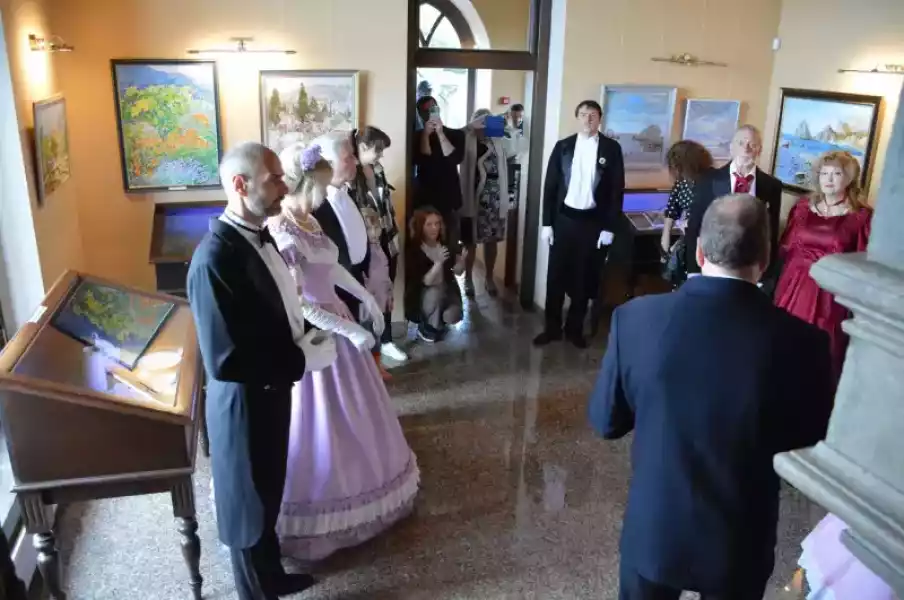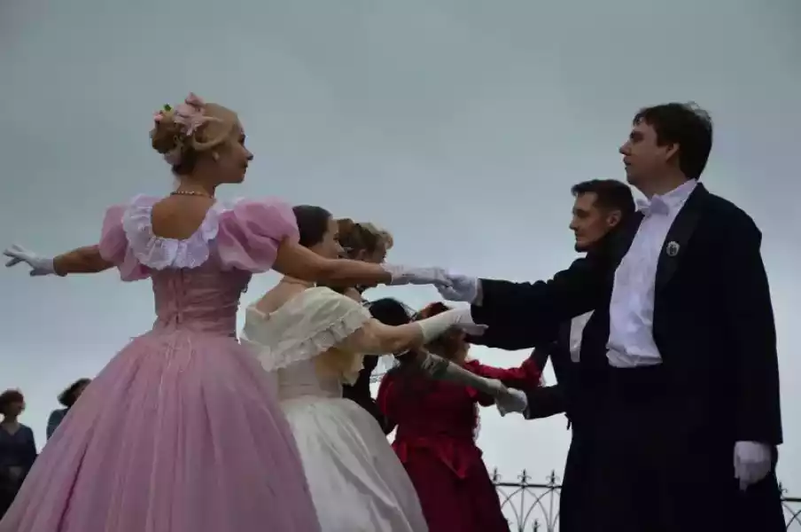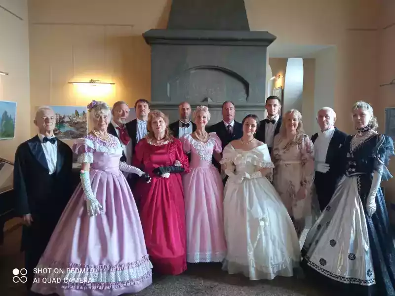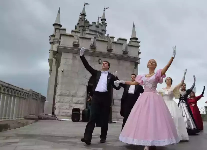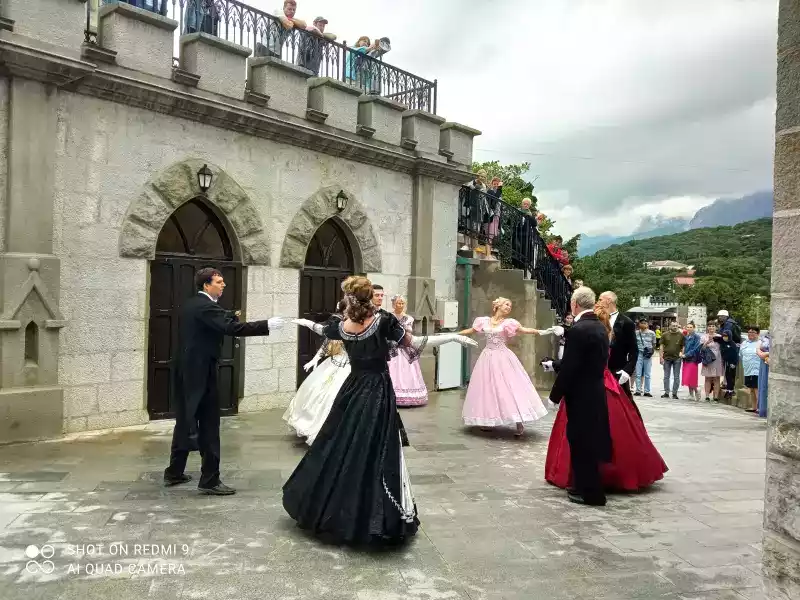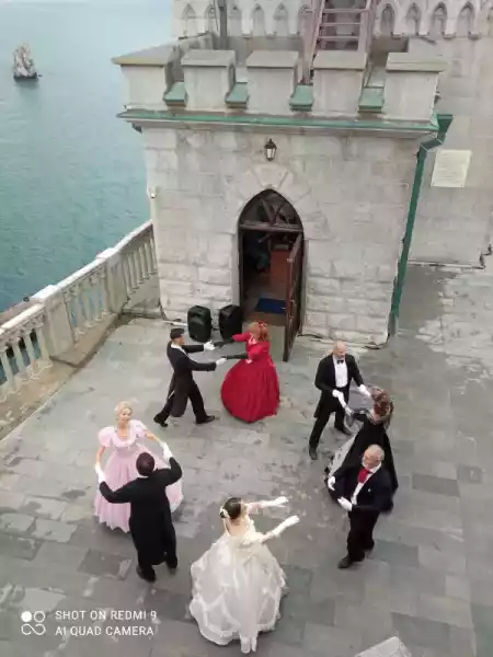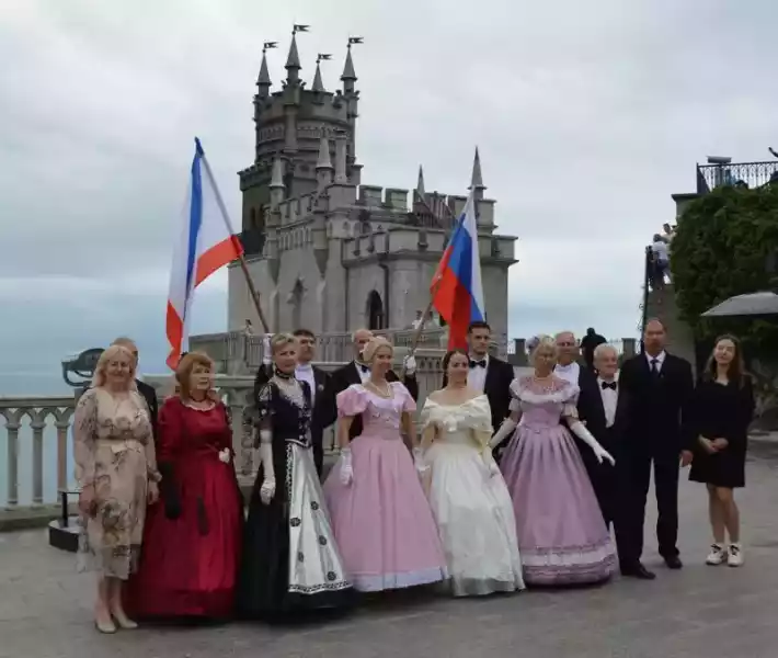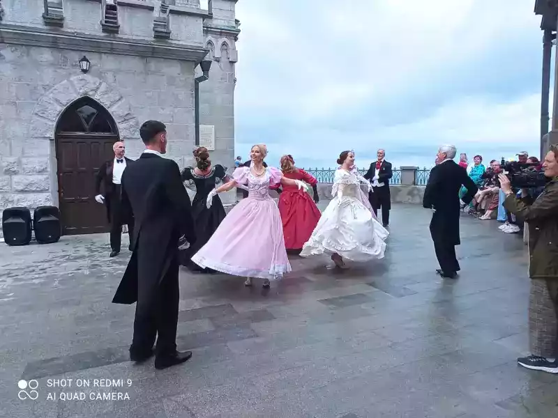 Утончённые барышни в пышных нарядах и кавалеры в строгих фраках воссоздав дух эпохи, передавали романтическую и изысканную атмосферу светских балов того времени и очень органично смотрелось на фоне объекта культурного наследия Федерального значения дворца-замка Ласточкино гнездо, построенного в аналогичный исторический период.