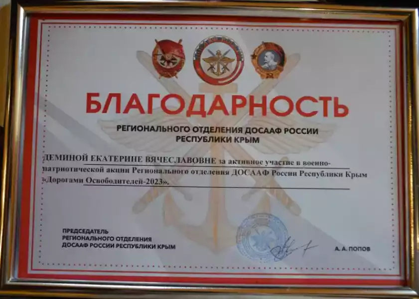 Так совпало, что в этот праздничный день - День России, представитель ДОСААФ России по г. Ялта Денис Ковалёв (участник клуба исторического танца «Феерия») выполнил почётную миссию поздравив присутствующих с праздником и вручил Благодарность регионального отделения ДОСААФ России по Республики Крым за активное участие в военно-патриотической акции Регионального отделения ДОСААФ России РК «Дорогами Освободителей 2023», Екатерине Дёминой.