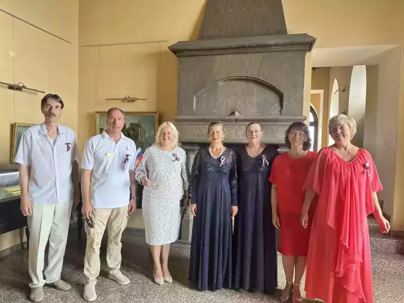 Традиционно все участники праздничного концерта сфотографировались на фоне дворца-замка с флагом Российской Федерации.